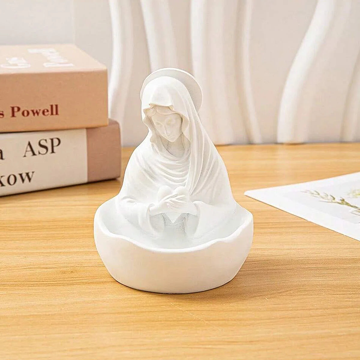 La figura transmite calma y contemplación, convirtiéndose en una presencia significativa para el altar, la mesa de oración o cualquier espacio devocional del hogar. Es una pieza que une simbolismo y funcionalidad, integrando la oración al día a día de manera sencilla.